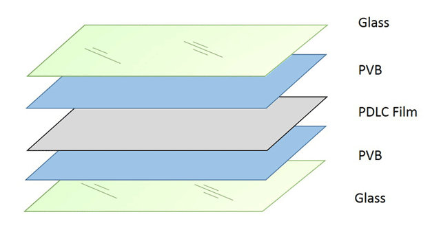 其實(shí)它并不是什么魔術(shù),而是在玻璃之間有一層液晶調(diào)光膜(PDLC),通過一種復(fù)合膠將其緊密的固定在兩塊玻璃之間。